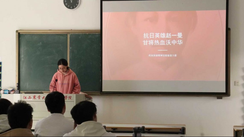 11月28日,学生党员卞新月讲述《抗日英雄·赵一曼》的英勇事迹,通过感人至深的革命故事,让同学们深刻体会到抗日先烈为国家和民族挺身而出的无畏气概。