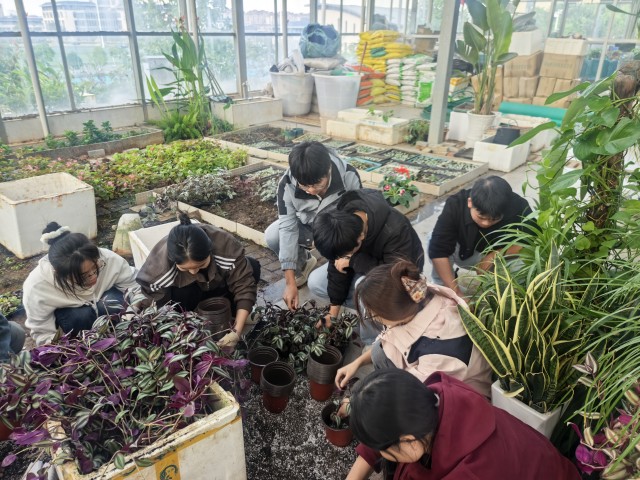 活动伊始,全体成员抵达基地后,在李琦老师的统筹下迅速分组,一场充满意义的劳动实践随即展开。同学们穿梭于温暖的玻璃花房,细致地移植兰花幼苗,还将形态各异的多肉植物逐一移栽到精致的陶盆中,指尖的呵护尽显对生命的珍视。用过的劳动工具也被大家悉心清洗后悉数归位,良好的素养与自律的意识贯穿始终。花房里,移植的绿植错落有致,这些充满生机的成果不仅是劳动的结晶,更成为了鲜活生动的美育素材,让大家在实践中直观感受“美在劳动、美在创造”。